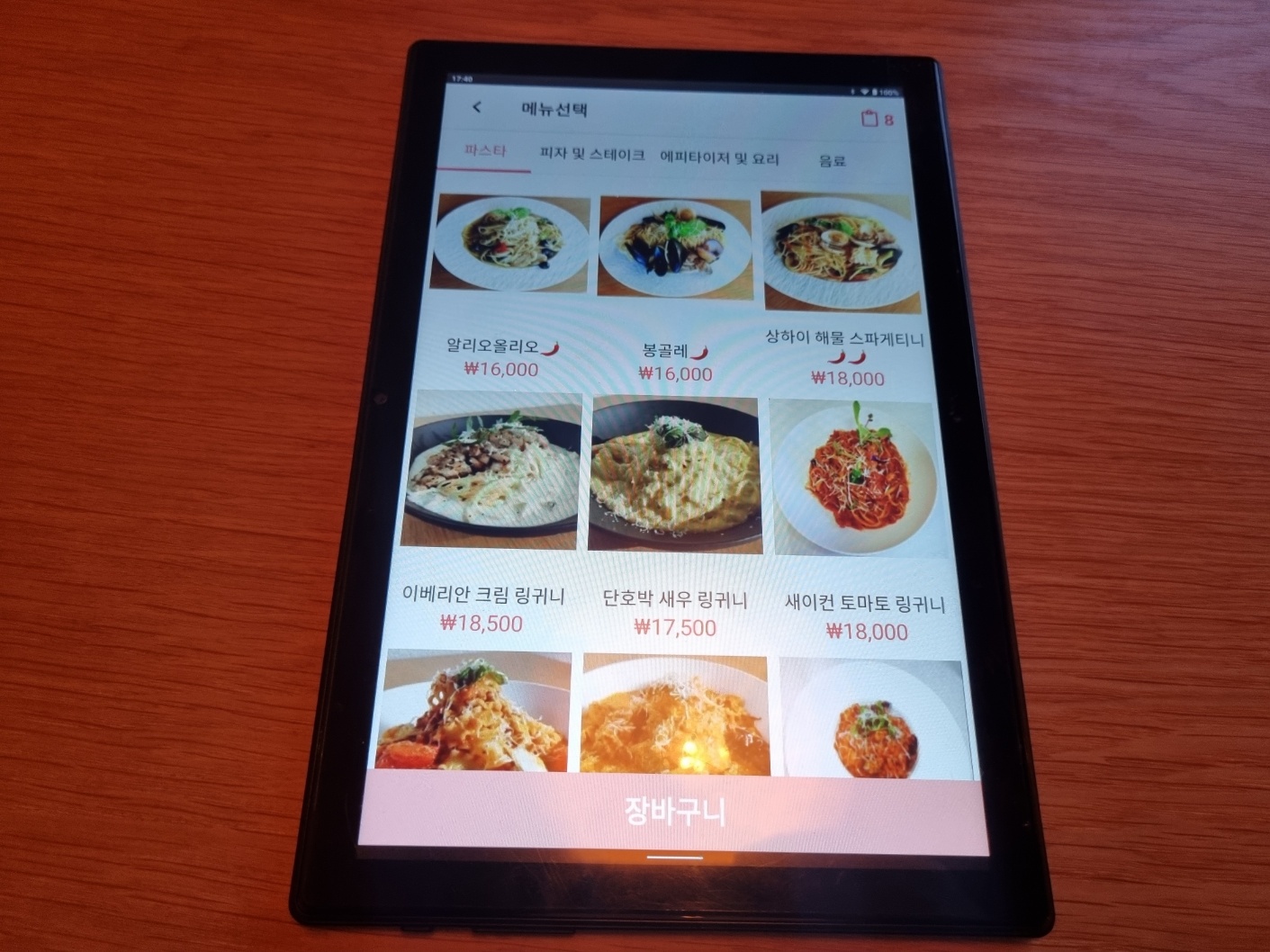 메뉴는 이탈리안 레스토랑처럼 샐러드 + 파스타 + 스테이크 + 리조또였습니다. 남편과 나는 와인 한 병, 스테이크 저녁 식사, 해산물 스파게티(파스타)를 주문했습니다. 디너 스테이크(29,000원)는 오후 5시 이후 주문 가능하며, 런치 스테이크(25,000원)는 언제든 주문 가능하다. 저녁 식사는 약간 더 비싸지만 더 크며 구운 야채와 밥이 함께 제공됩니다. 태블릿으로 주문할 수 있습니다.
