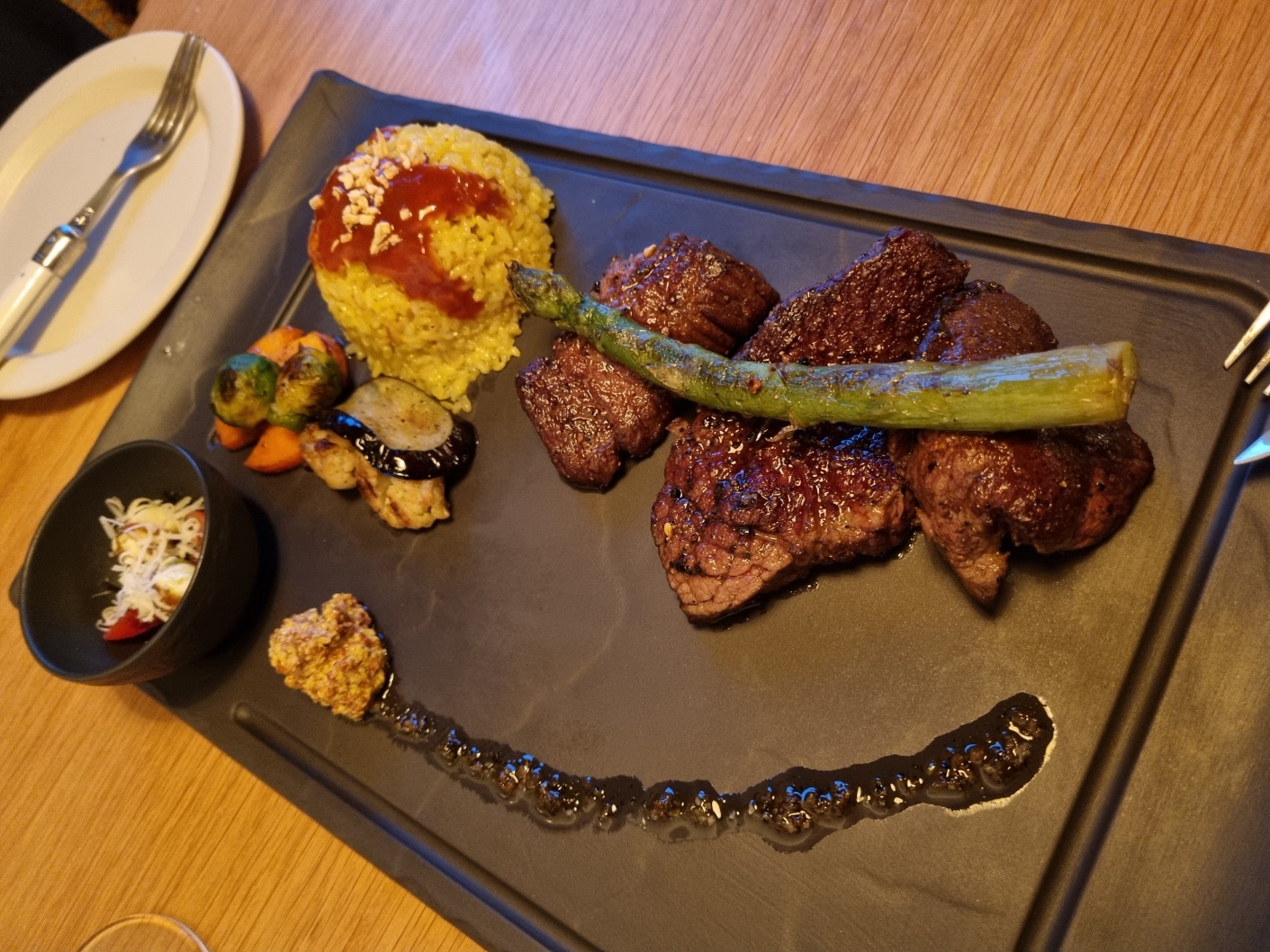 디너 스테이크, 구운 야채에는 양배추, 가지, 당근, 아스파라거스가 포함됩니다. 밥도 한공기 정도 나옵니다. 스테이크 굽는 방법을 미리 물어보는데 아내와 나는 스테이크 반, 미디엄 레어, 웰던으로 부탁했다. 한참을 고민했는데 먼저 반반 굽겠다고 흔쾌히 해주셨어요. ^.^/