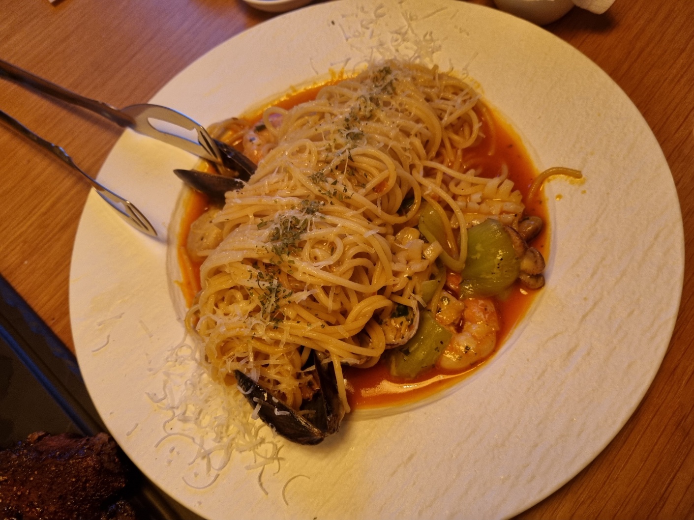 상하이 해산물 스파게티. 잘 말린 국수와 상하이 소스가 잘 어울립니다. 소스의 풍미가 칵테일 새우, 청경채, 조개 등 해산물에 잘 스며들었다. 면 위에 치즈가루와 파슬리가 뿌려져 있어 보는 재미와 먹는 재미를 동시에 높인다. 약간 매콤한 것을 원하신다면 상하이파스타 추천!
