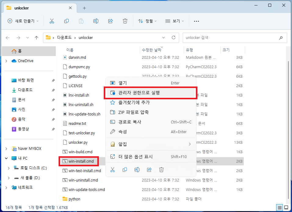 win-install.cmd 파일 ‘관리자 권한으로 실행‘. (VMware가 종료된 후여야 합니다.)