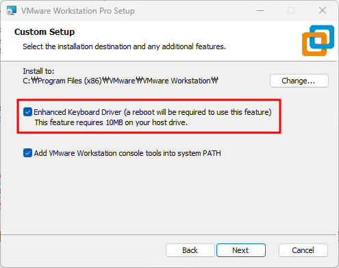 Custom Setup 단계에서 ‘C:\Program Files (x86)\VMware\VMware Workstation’의 기본 설치 경로를 확인하고 환경에 맞게 다른 드라이브로 변경합니다. 추가 키보드 드라이버 설치 옵션 ‘ 고급 키보드 드라이버’ 확인하다필요한 경우 콘솔 도구에 VMware 시스템 경로를 추가하는 ‘ VMware Workstation 콘솔 도구 시스템 경로 추가’를 체크한 후 ‘다음’ 버튼을 선택합니다.