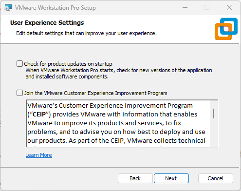 컴퓨터 시스템 시작 시 프로그램 업데이트 확인‘□ 시작 시 제품 업데이트 확인’ VMware 고객 개선 프로그램에 참여하십시오.‘□ VMware 고객 개선 프로그램에 참여하세요’ 체크 해제그리고 ‘다음’