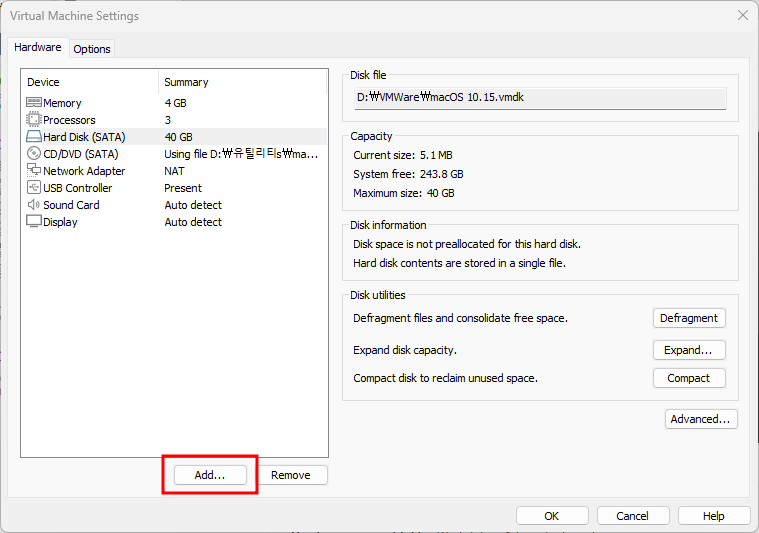 하프 디스크(SATA) > 추가…를 클릭합니다.