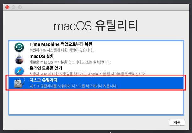 먼저 포맷을 위해 디스크 유틸리티를 실행하십시오.